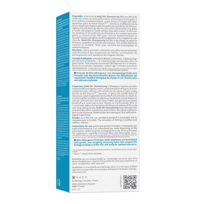 Nodé DS+ Shampooing facilite le démêlage et apporte brillance, souplesse et volume aux cheveux. Très bonne tolérance cutanée et oculaire. Testé sous contrôle dermatologique et ophtalmologique.