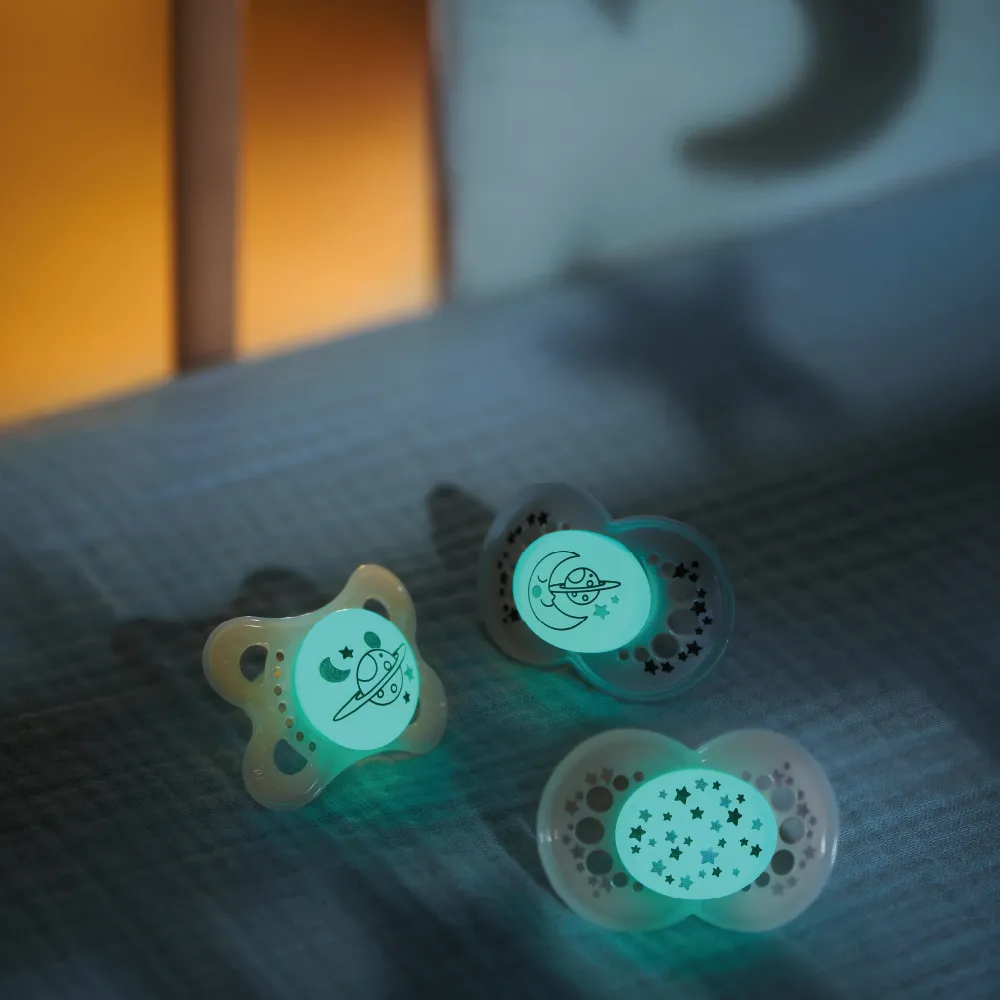 Notre sucette MAM Original Nuit existe dans de nombreuses collections et brille dans le noir pour la retrouver facilement.