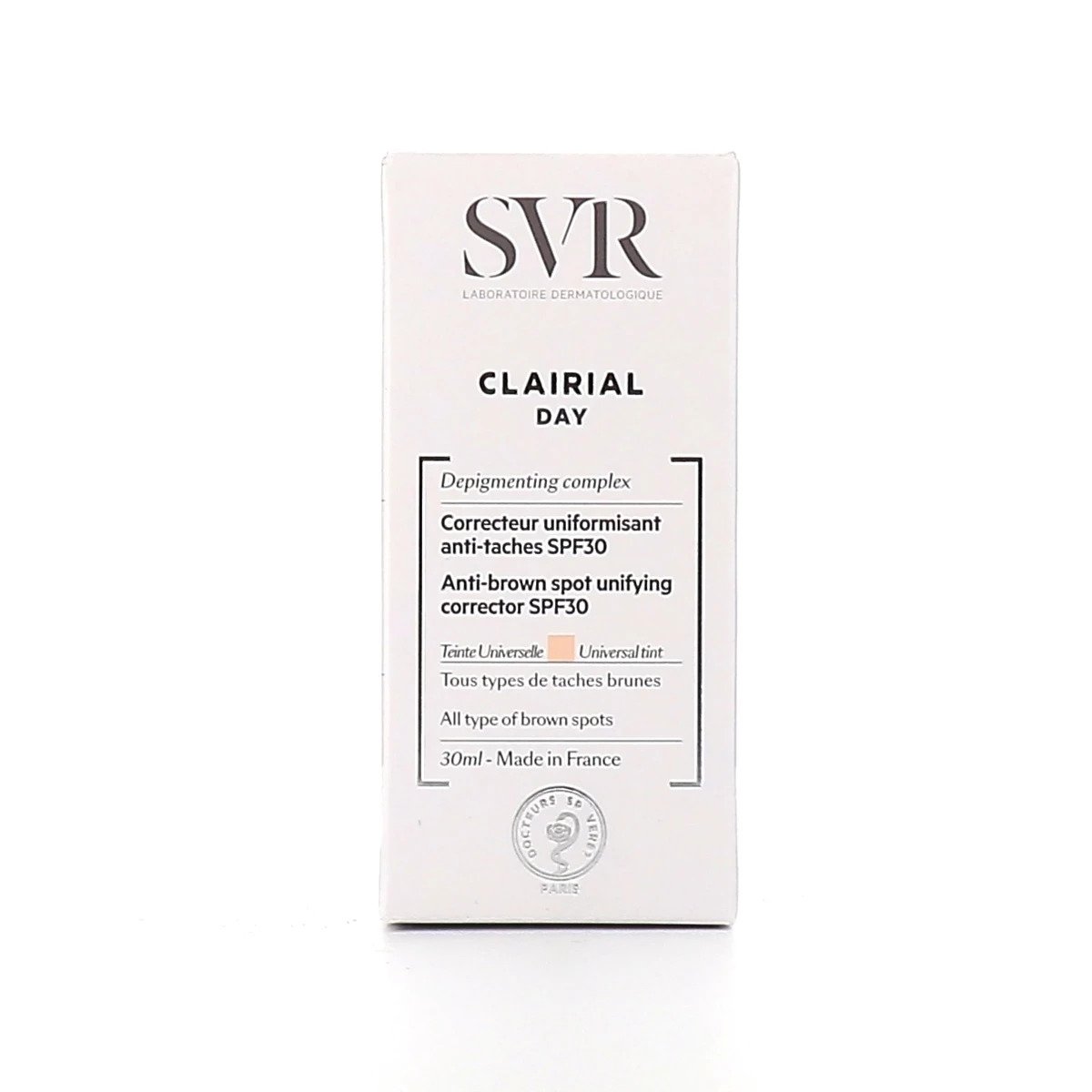 Les présentations proposées sur notre pharmacie en ligne pour le correcteur uniformisant anti-taches Clairial Day de SVR : flacon de 30 ml.